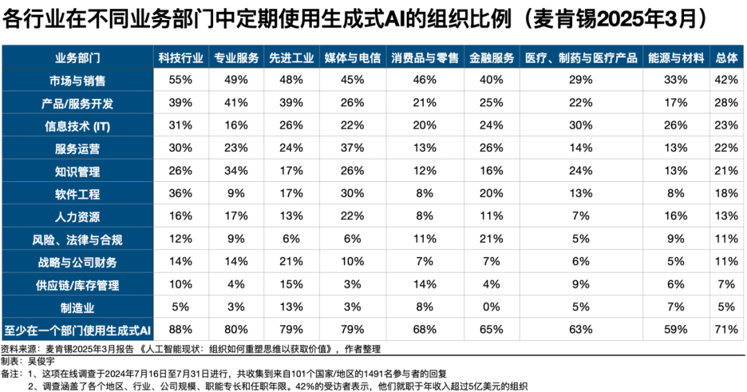 国际管理咨询机构麦肯锡2025年3月调研101个国家的1491个企业管理者发现,2024年末已经至少有71%的企业正在使用生成式AI,在三个以上业务部门中使用生成式AI的企业超过45%。这两项数据相比2023年均大幅增长。