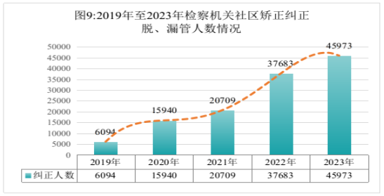 3.加强非监禁刑执行监督。强化社区矫正监督,发布典型案例,出版《社区矫正检察监督实务研究与案例指引》,对监外执行条件消失的,督促收监执行3652人。联合最高法开展“雷霆2023”专项活动,经检察监督推动执行案件3491件,涉及金额数亿元。社区矫正对象王某某漏管法律监督一案,检察机关强化对社区矫正交付接收环节检察监督,深挖背后司法工作人员失职渎职犯罪,王某某被撤销缓刑,与所犯新罪数罪并罚,合并执行有期徒刑二十一年,对社区矫正漏管背后的相关司法工作人员职务犯罪立案侦查。
