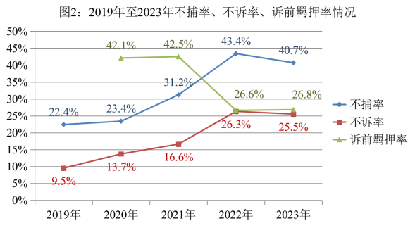 全国检察机关全面准确贯彻宽严相济刑事政策,依法把握不批捕、不起诉的标准和条件,办案质效进一步提升。在不捕率、不诉率总体上升的同时,依法坚决严惩严重犯罪,对危害国家安全、严重危害公共安全的案件批捕率、起诉率稳定保持在95%以上。对黑恶犯罪保持高压态势,起诉涉黑涉恶犯罪14902人,同比上升 5.2%。对轻微犯罪依法从宽处理,以无逮捕必要不捕26.6万人,同比上升22.5%,以犯罪情节轻微不诉49.8万人,同比上升12.6%。在依法严格把握逮捕条件基础上,开展羁押必要性审查178827人次,提出变更建议或者直接变更29755人次,诉前羁押率[1]26.8%,同比增加0.2个百分点,防止“一押到底”。对拟不起诉案件、审查逮捕案件、羁押必要性审查案件开展听证133414件次,同比上升30%,在给不捕不诉“加把锁”、规范检察权运行的同时,让事更清、理更明、法更透。坚持以案释法,讲好检察故事。最高检指导、国内首部聚焦“正当防卫”主题的电影《第二十条》上映后,社会广泛关注反响良好。该部电影是对近年来检察机关秉持“法不能向不法让步”理念,激活刑法第二十条生动实践的艺术呈现。2019年至2023年检察机关以正当防卫作出不捕不诉的人数是前五年的3.6倍。
