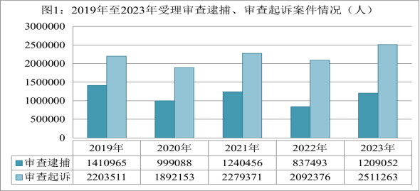 随着新冠疫情防控转段,我国经济回升向好,社会活跃度增加,同时,检察机关与有关部门一道依法从严惩处电信网络诈骗等严重影响人民群众安全感的犯罪,刑事犯罪案件总量增长。2023年,全国检察机关受理审查逮捕各类犯罪828999件1209052人,同比分别上升49.8%、44.4%。审查后共批准逮捕72.6万人,同比上升47.1%;受理审查起诉各类犯罪1786635件2511263人,同比分别上升19.7%、20%。审查后决定起诉168.8万人,同比上升17.3%。