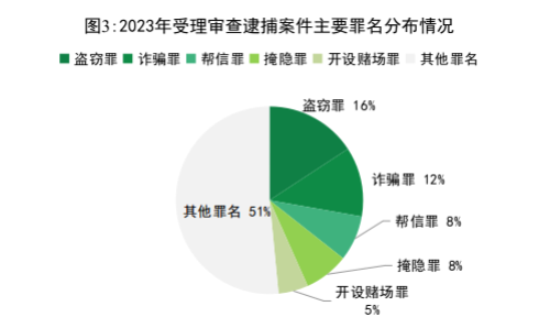 党的十八大以来,在以习为核心的党中央坚强领导下,我国持续保持经济快速发展和社会长期稳定。在刑事案件总量长期高位运行的情况下,全国检察机关起诉严重暴力犯罪从1999年16.2万人下降至2023年6.1万人,占比从25.1%下降至3.6%。与此同时,判处三年有期徒刑以下刑罚的轻罪案件人数占比从1999年的54.4%上升至2023年的82.3%。其中,审查逮捕案件中盗窃罪,诈骗罪,帮助信息网络犯罪活动罪(以下简称“帮信罪”),掩饰、隐瞒犯罪所得、犯罪所得收益罪(以下简称“掩隐罪”),开设赌场罪合计占48.4%。审查起诉案件中危险驾驶罪、盗窃罪、帮信罪、掩隐罪、诈骗罪合计占53.7%。