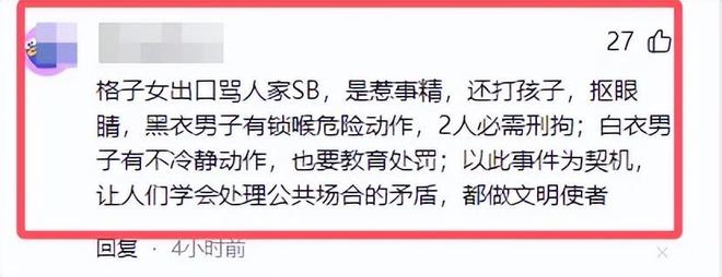 从网友转载的视频片段来看,很多人觉得情侣尤其是穿格子衣服的女子推抱孩子的女士,过错明显。