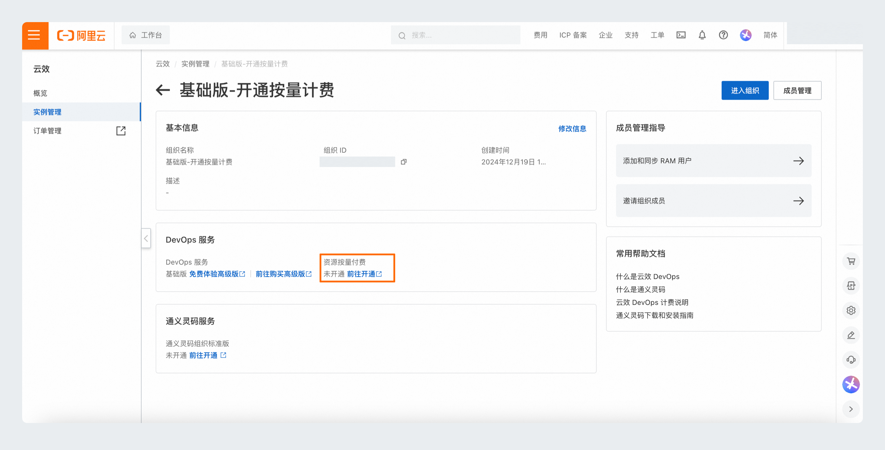 因合规性要求,自2025年1月3日起,云效订单下单人权限更新为“仅允许组织拥有者的阿里云主账号或其下具备 AliyunRDCFullAccess 权限的子用户下单”。